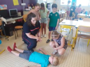 Durant un après-midi des pompiers volontaires de Chantonnay sont venus nous initier aux gestes de premiers secours. Nous avons vu ce qu’il fallait faire en cas de brûlure, de plaie et de malaise. Nous avons appris à mettre une personne en PLS.