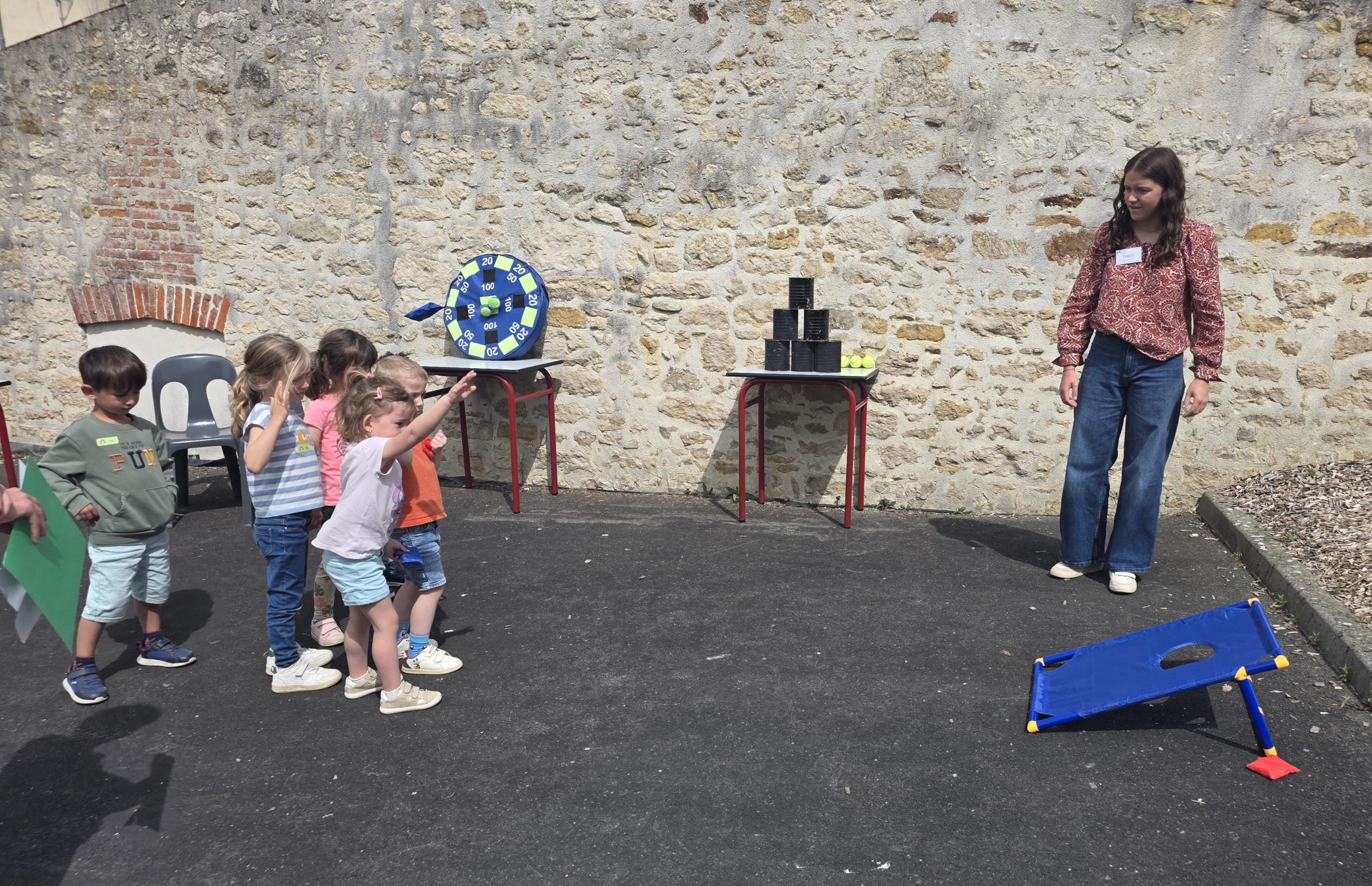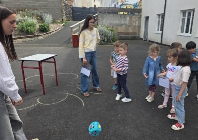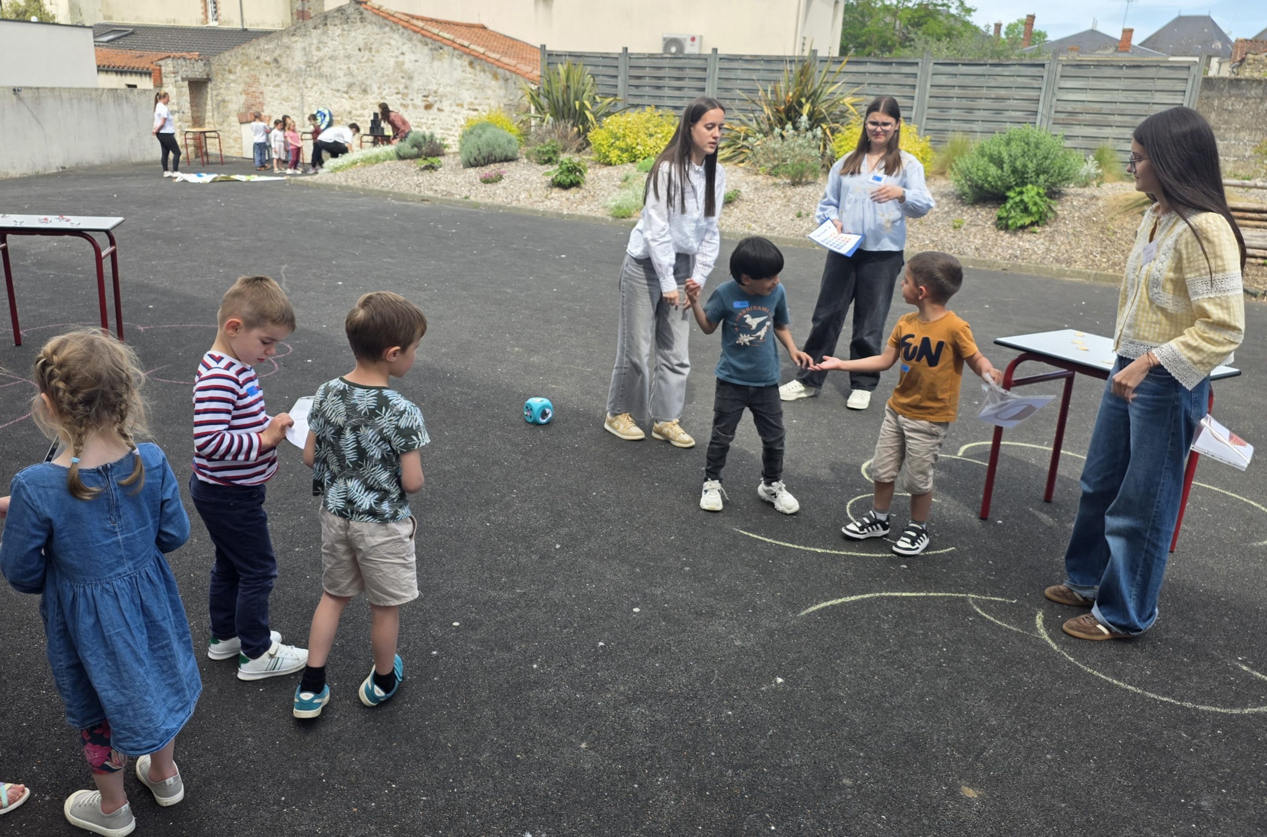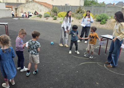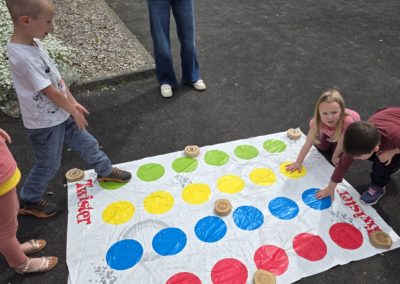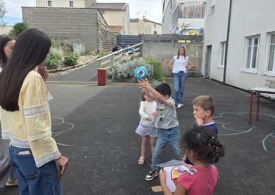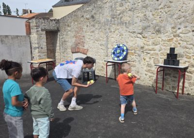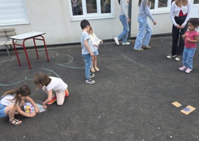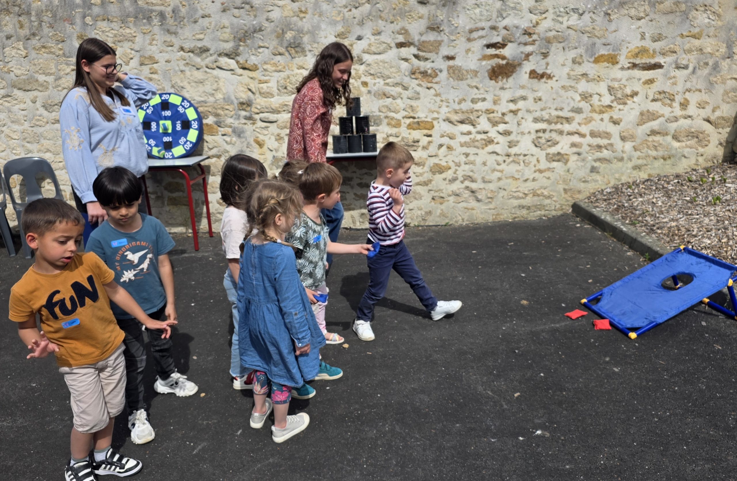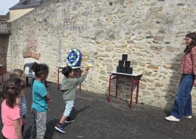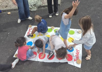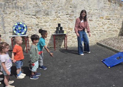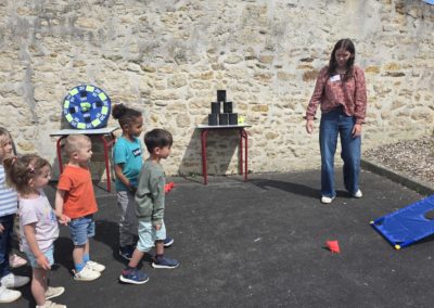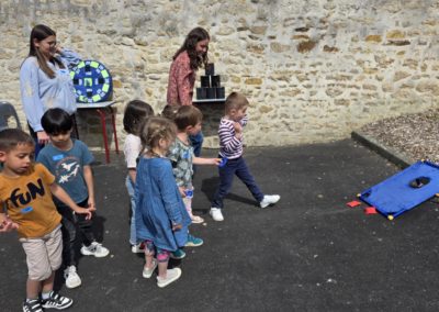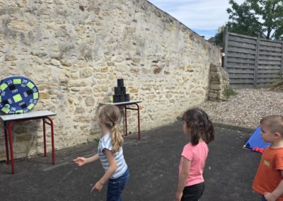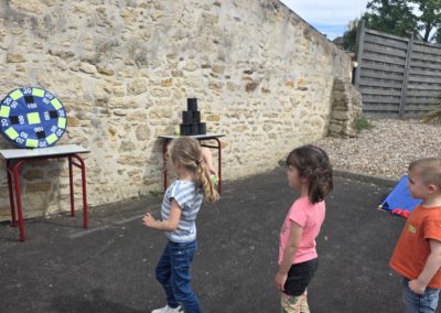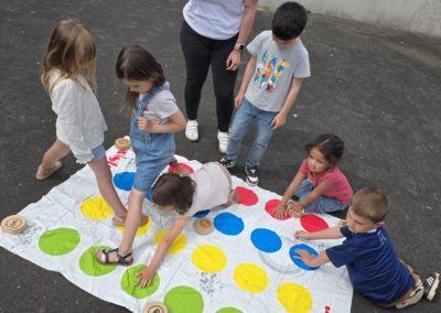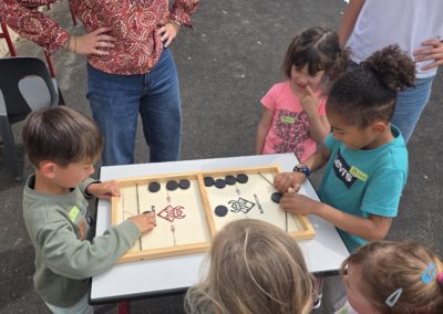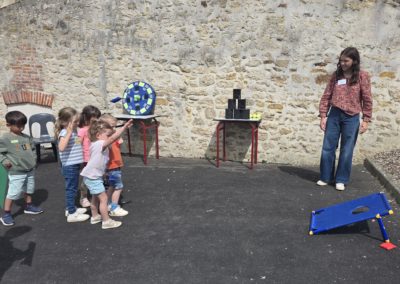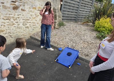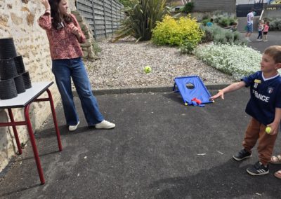 Ils nous avaient préparé différentes activités par petits groupes : lecture d’histoires, réalisation de semis, un jeu de société coopératif « le corbeau », des jeux de lancers sur une cible, un chamboule tout, un twister et autres jeux d’adresse !