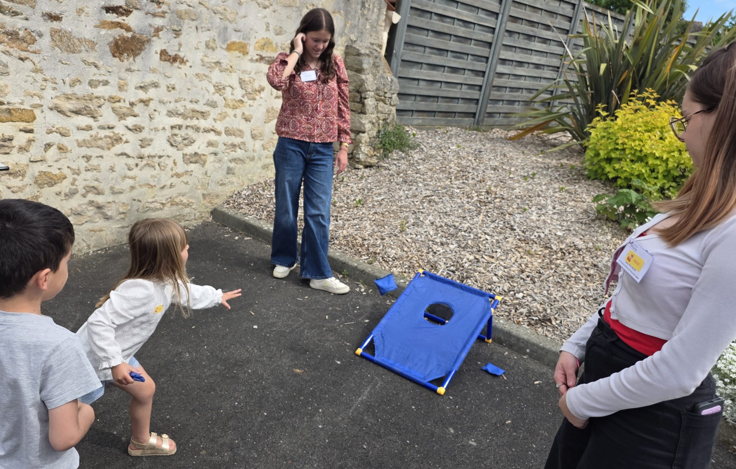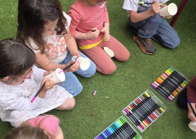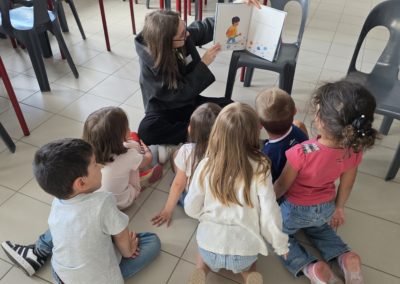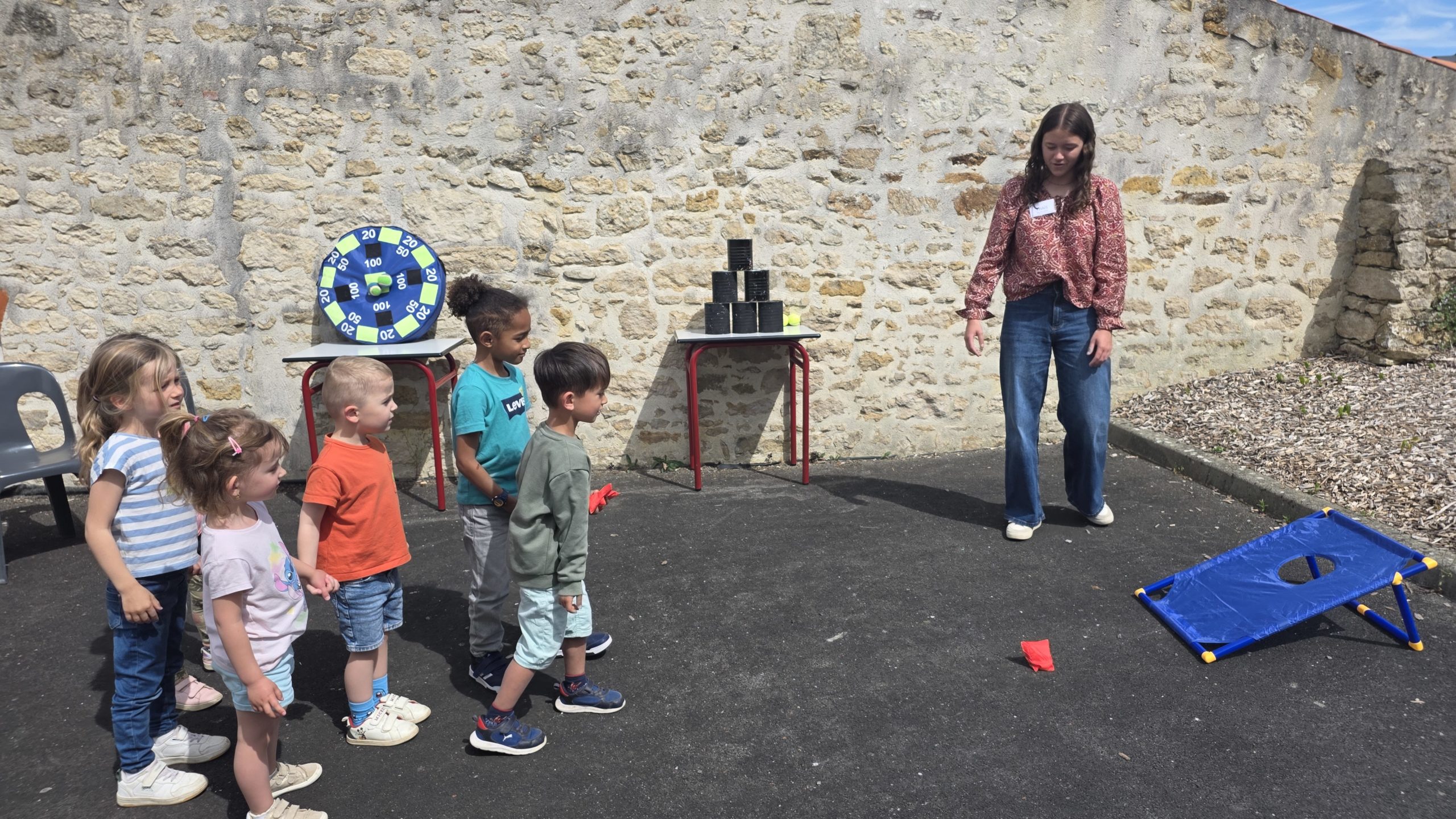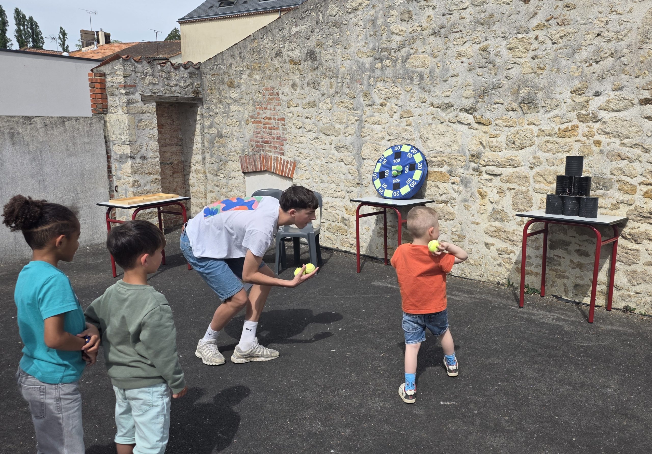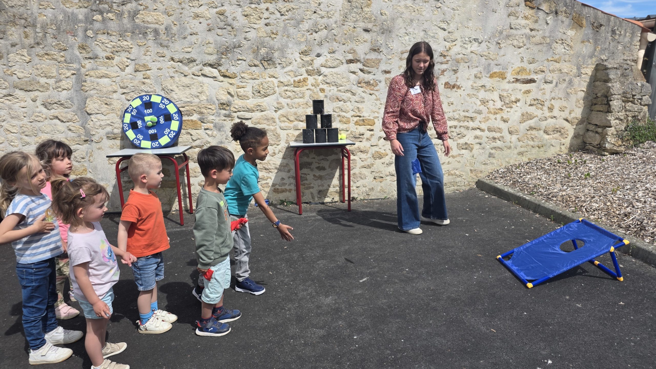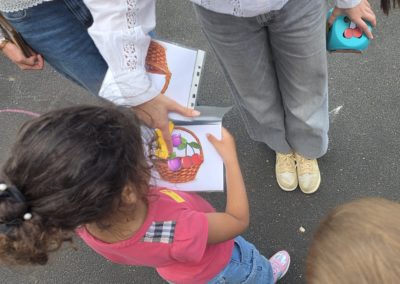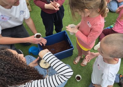 Ils nous avaient préparé différentes activités par petits groupes : lecture d’histoires, réalisation de semis, un jeu de société coopératif « le corbeau », des jeux de lancers sur une cible, un chamboule tout, un twister et autres jeux d’adresse !