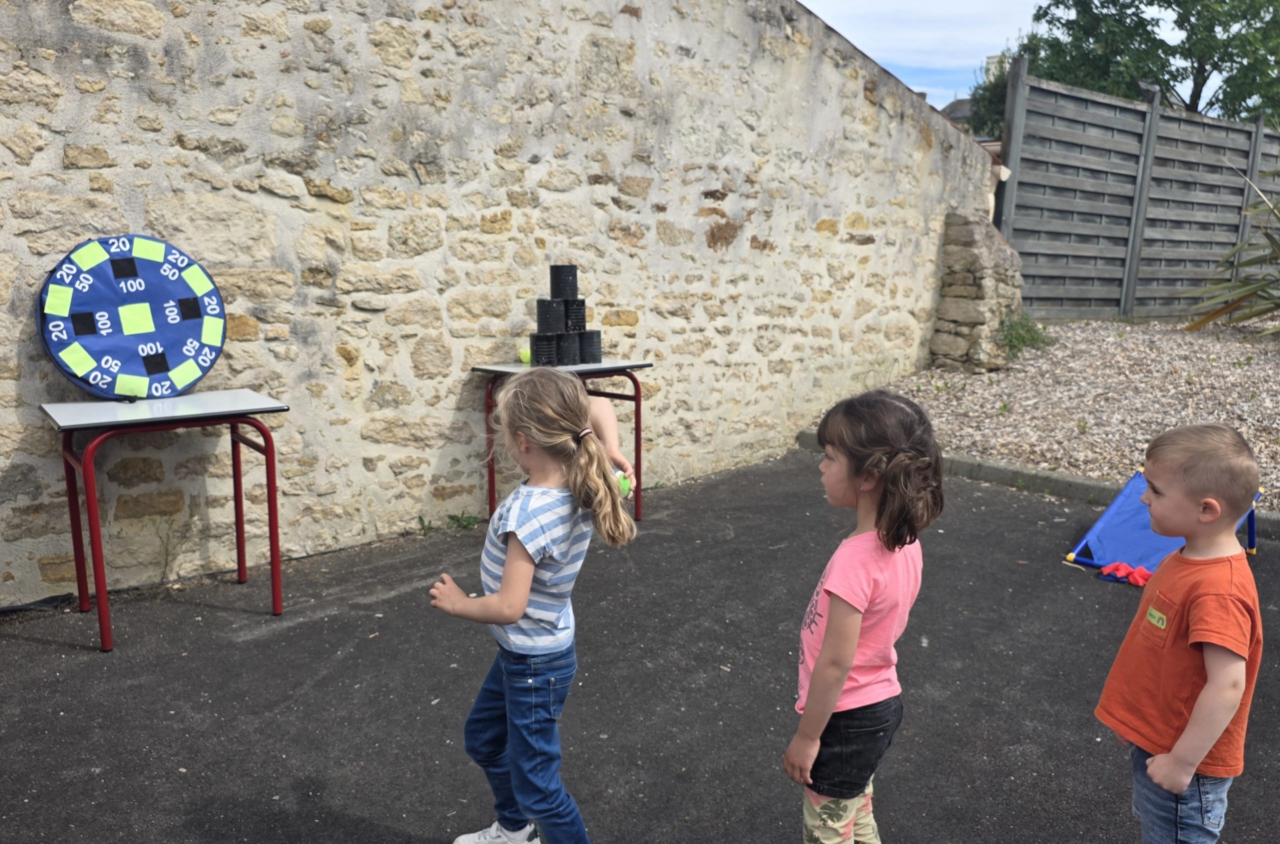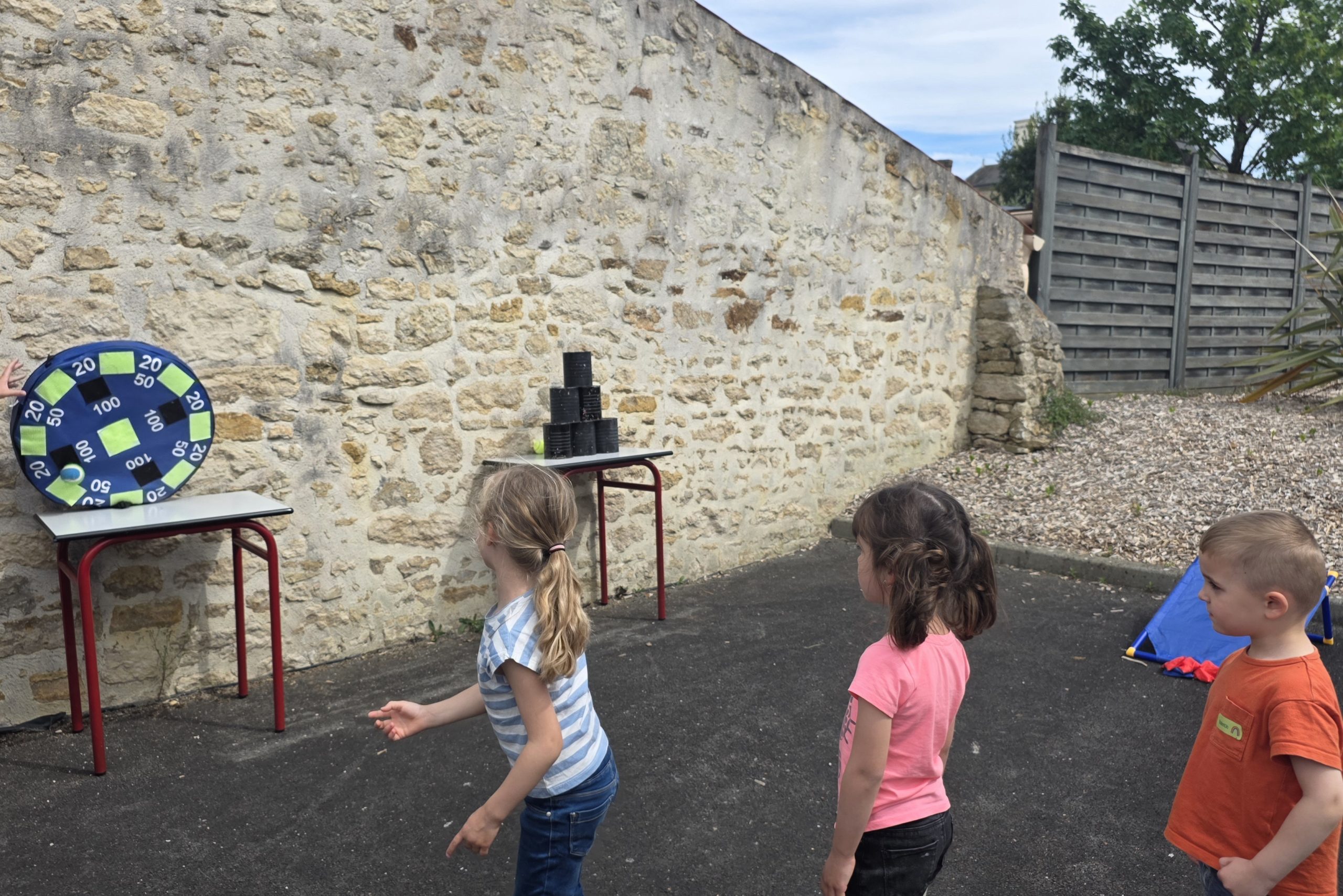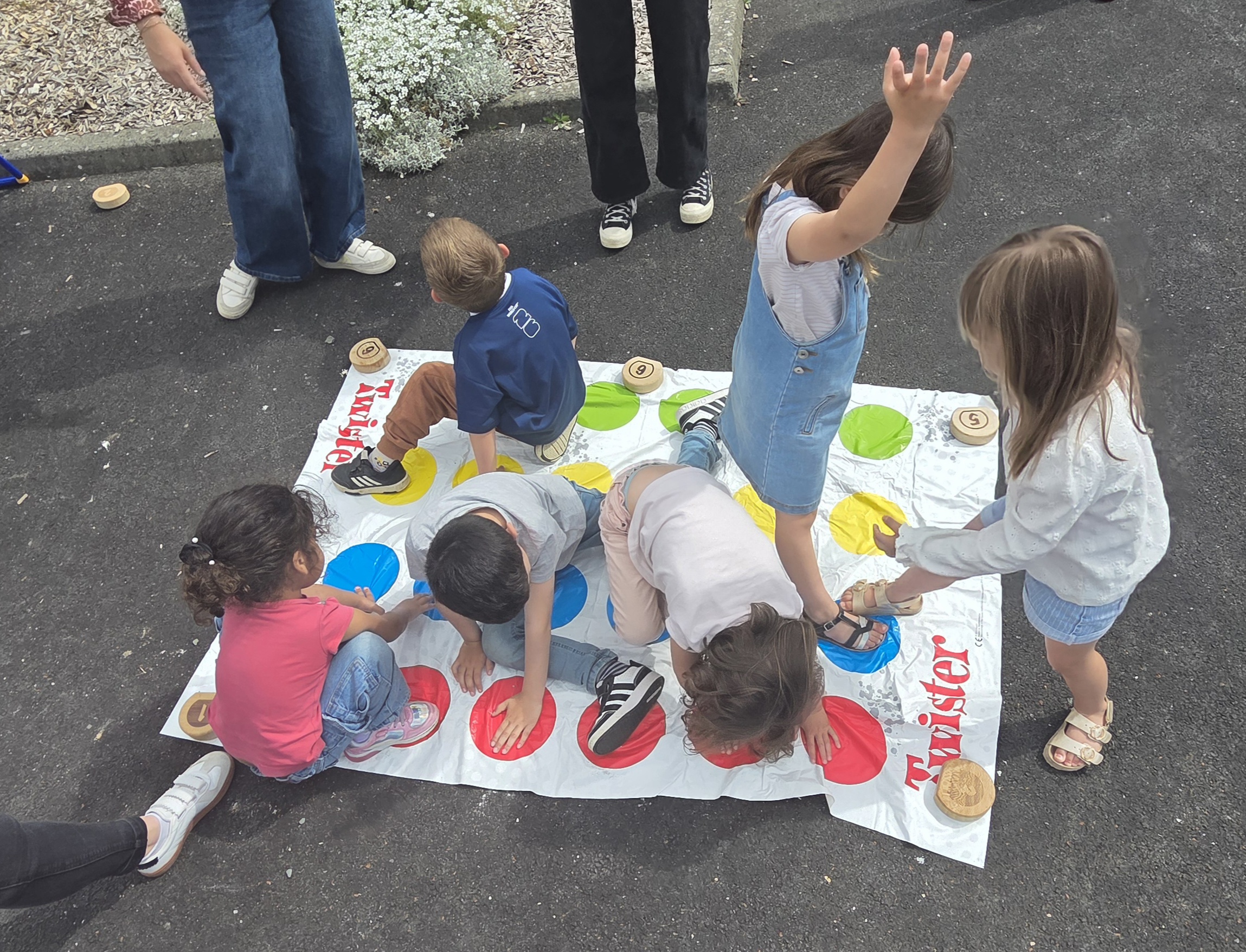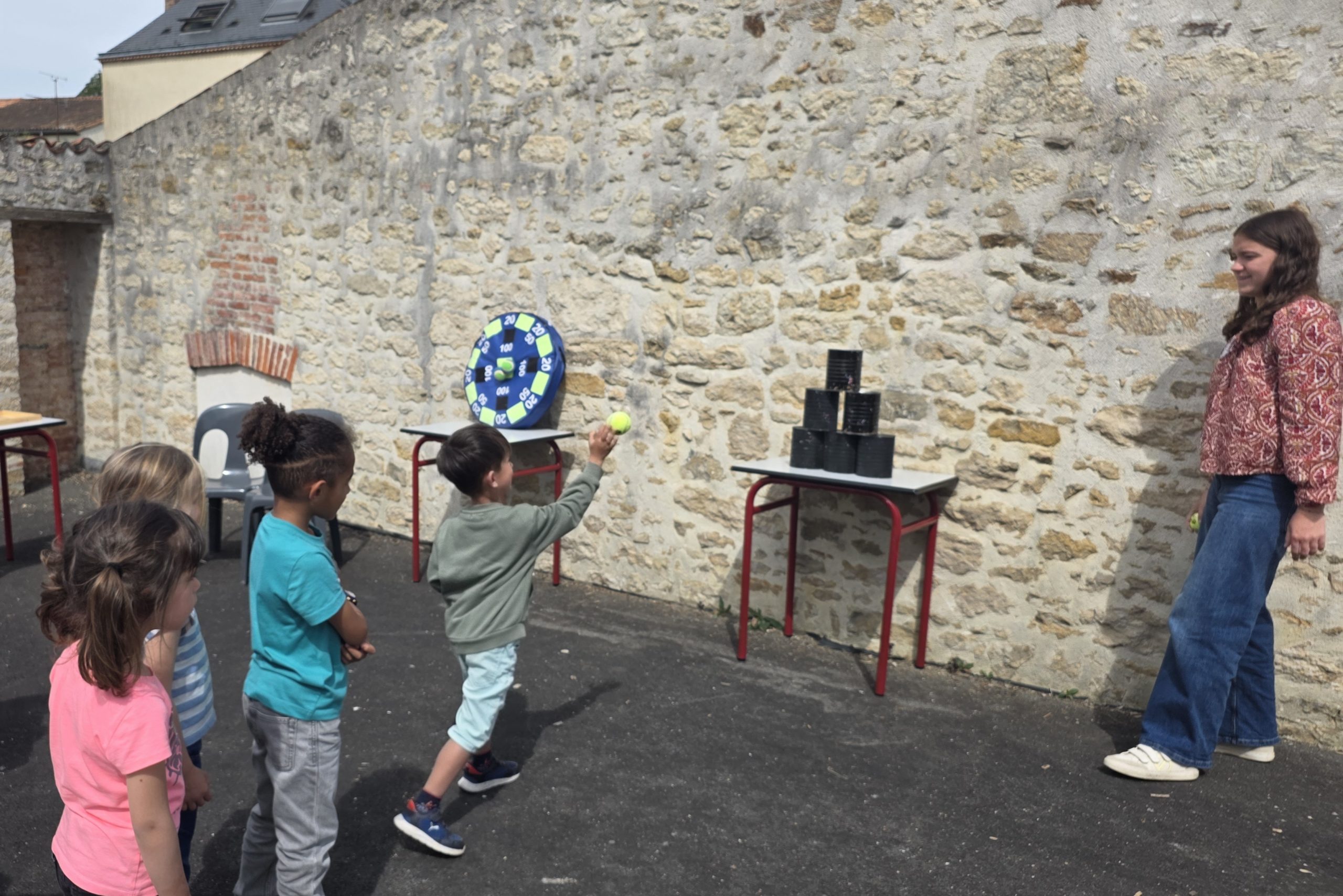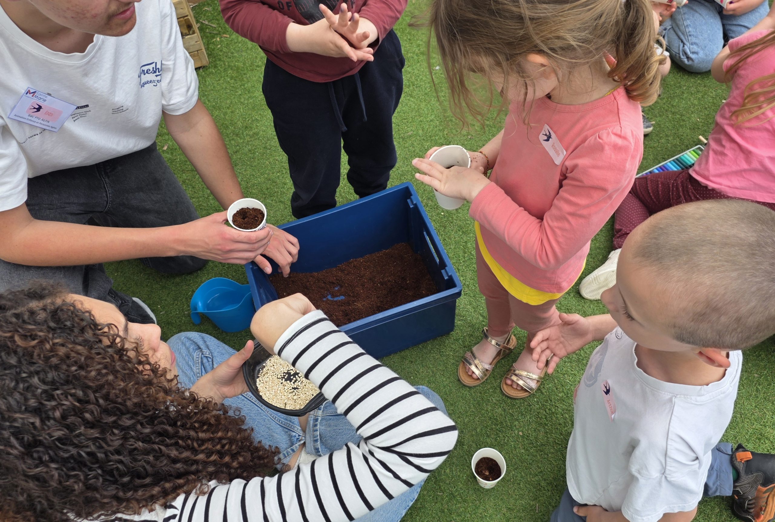 Ils nous avaient préparé différentes activités par petits groupes : lecture d’histoires, réalisation de semis, un jeu de société coopératif « le corbeau », des jeux de lancers sur une cible, un chamboule tout, un twister et autres jeux d’adresse !