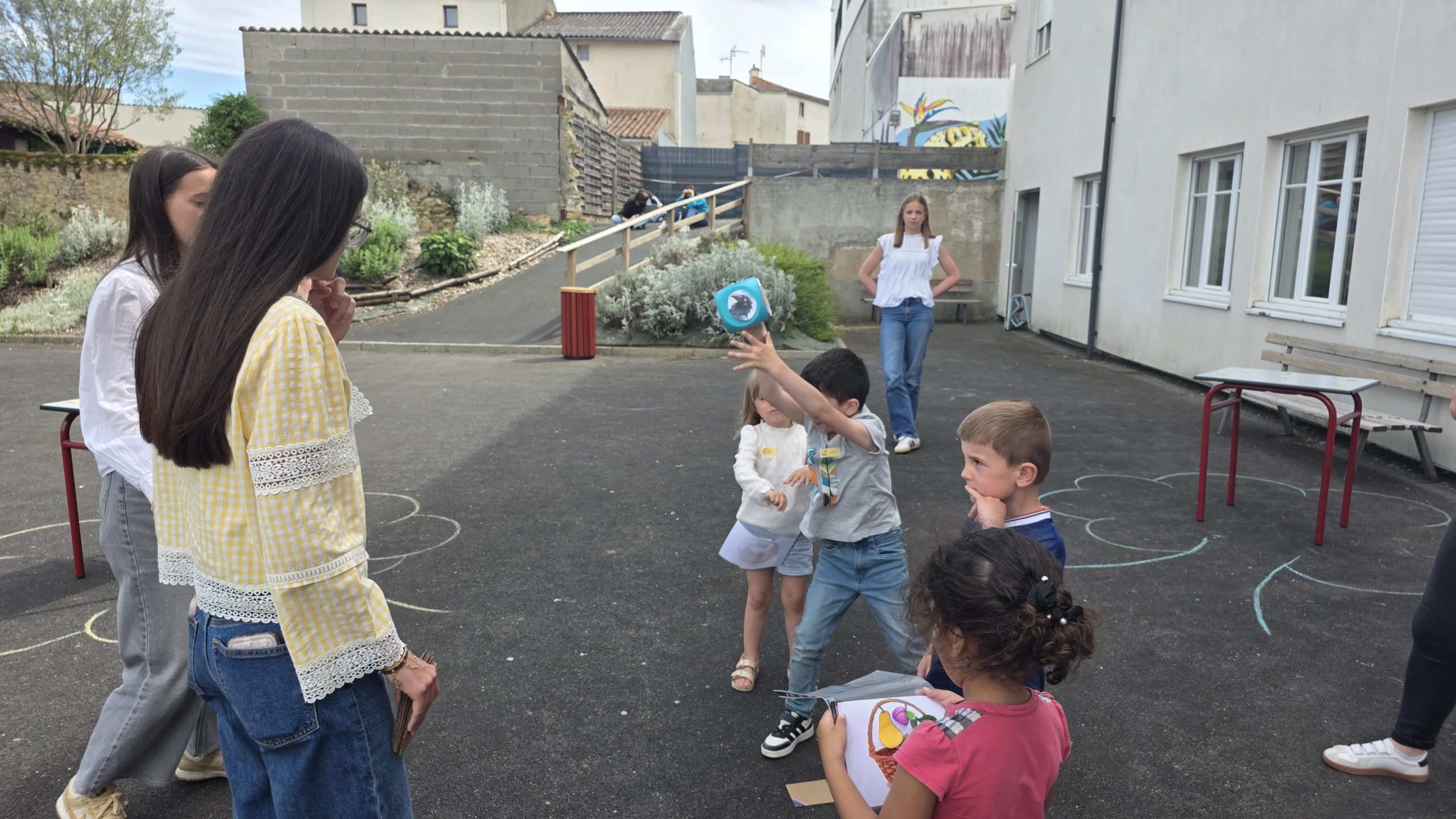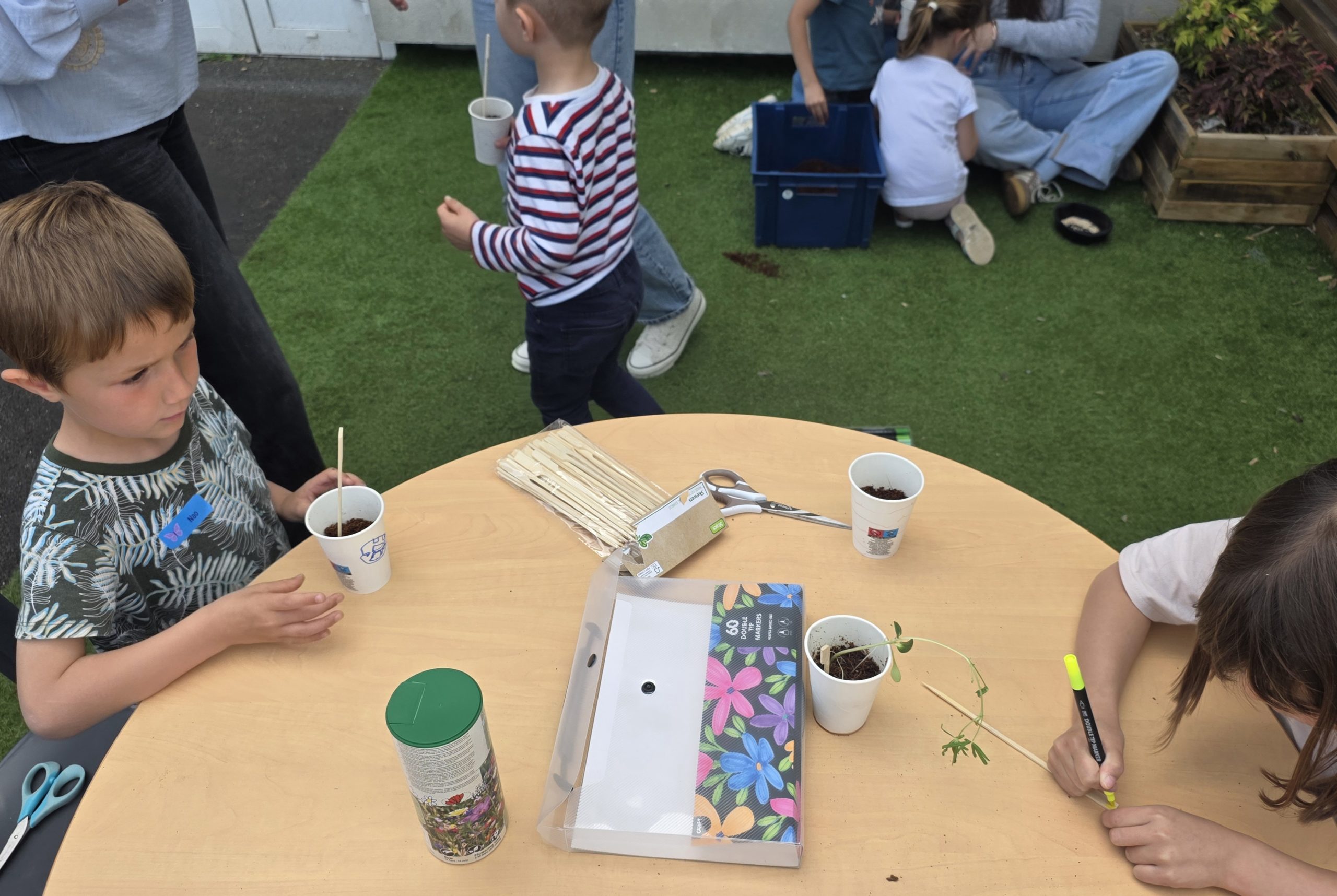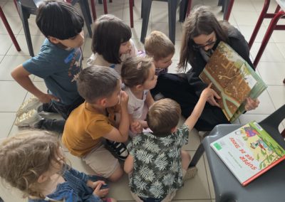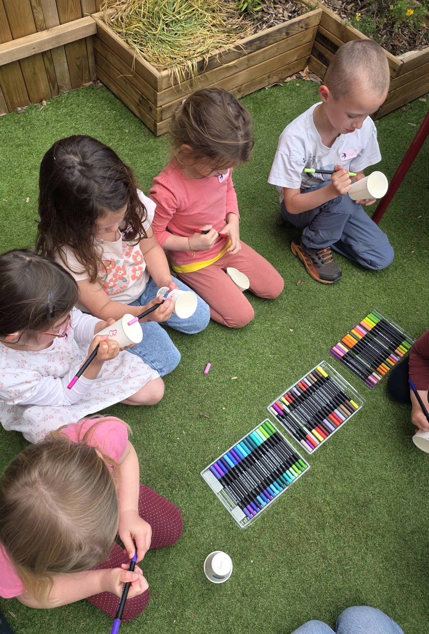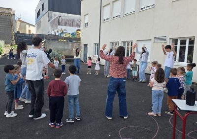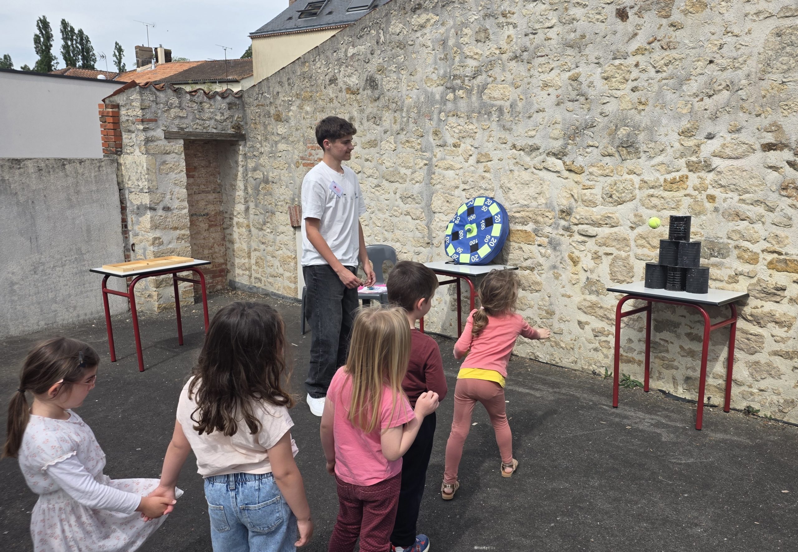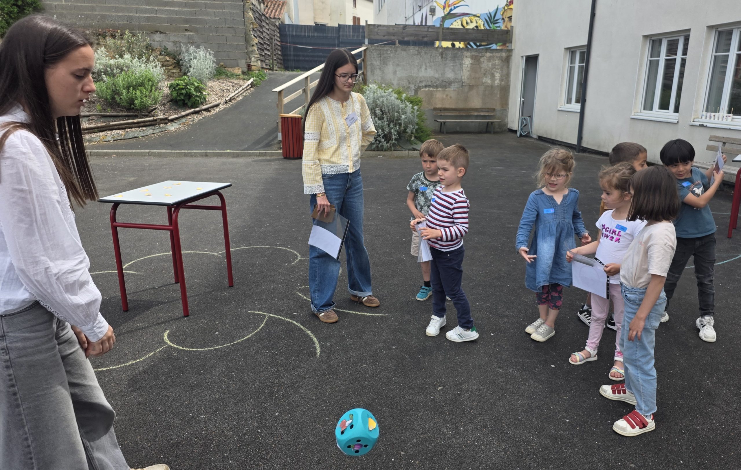 Ils nous avaient préparé différentes activités par petits groupes : lecture d’histoires, réalisation de semis, un jeu de société coopératif « le corbeau », des jeux de lancers sur une cible, un chamboule tout, un twister et autres jeux d’adresse !